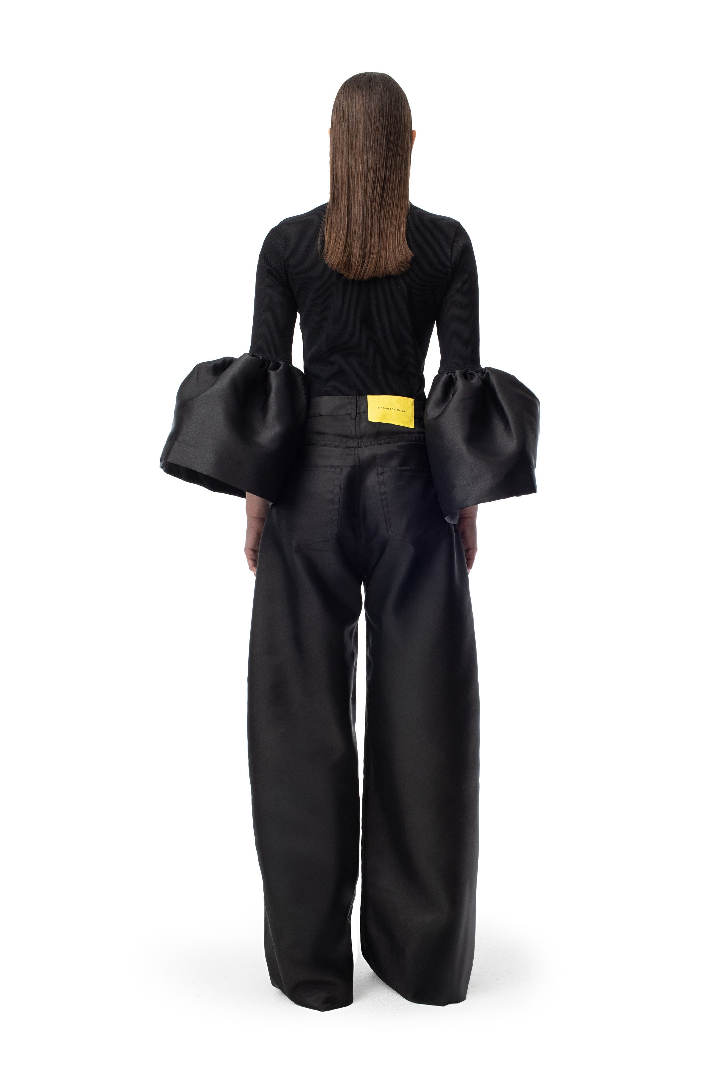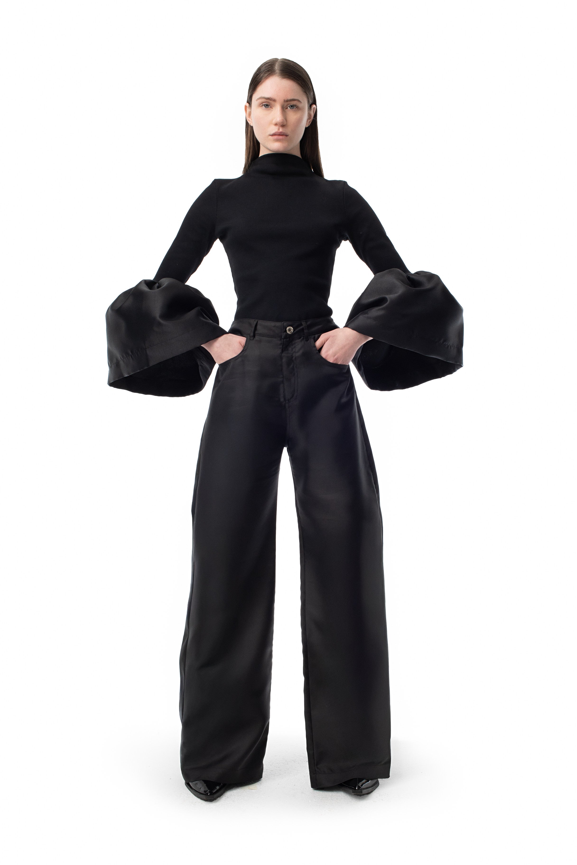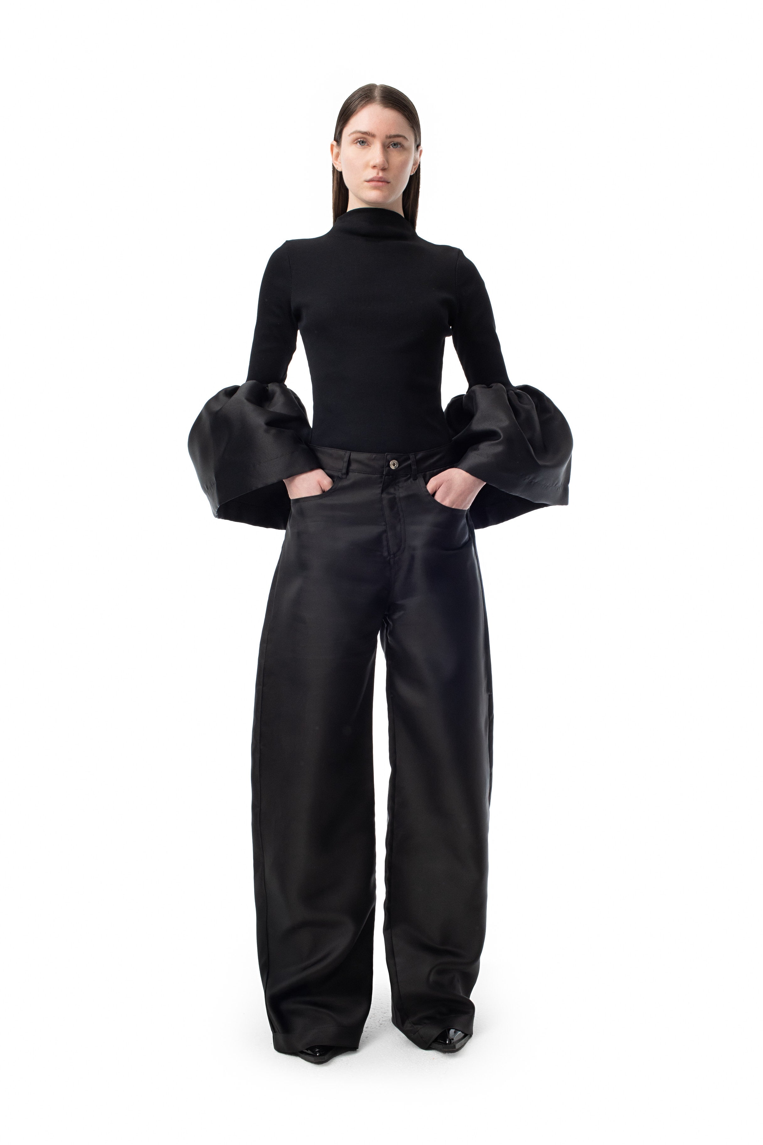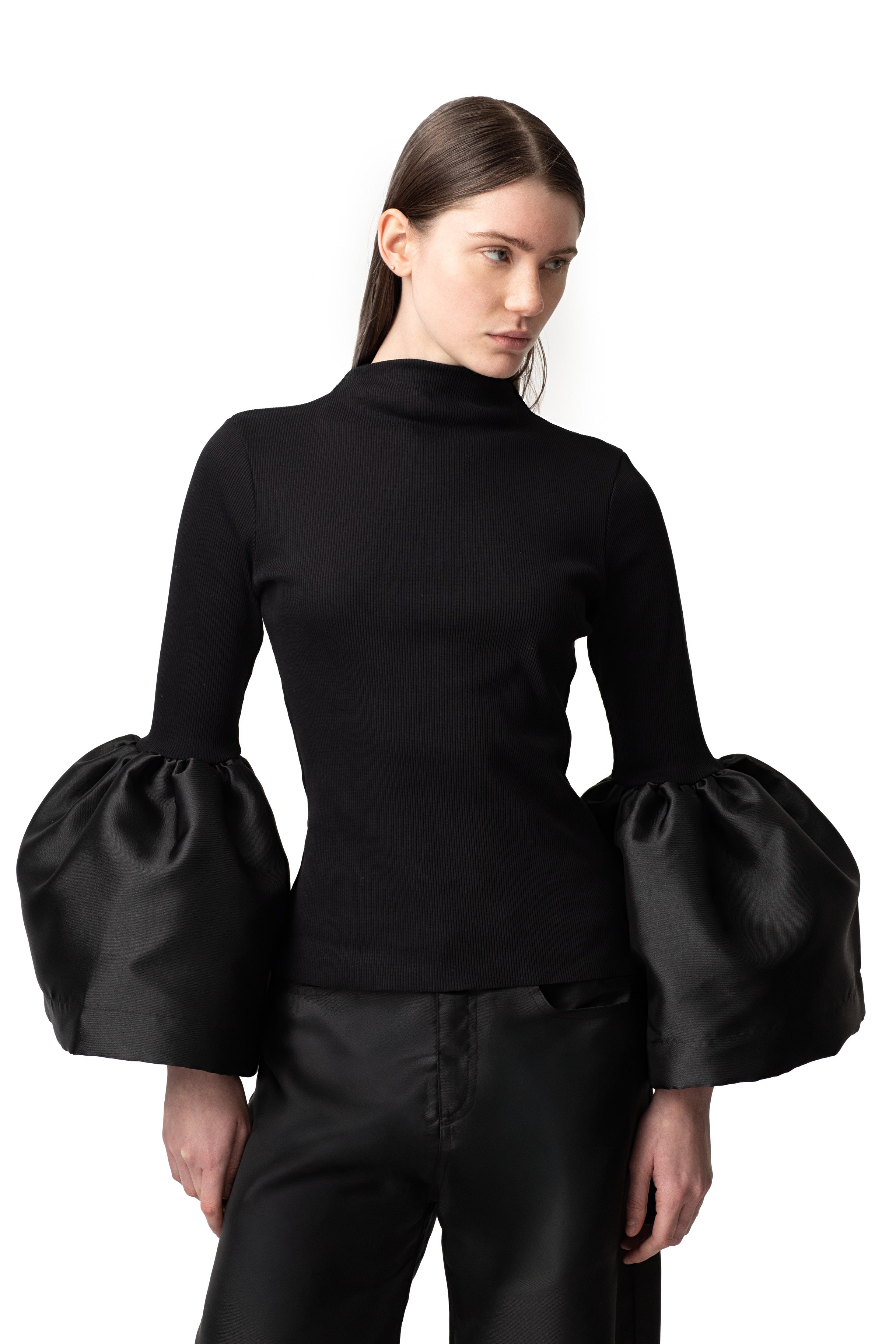 This sleek black top makes a statement with its high neck and mikado puff sleeves!
