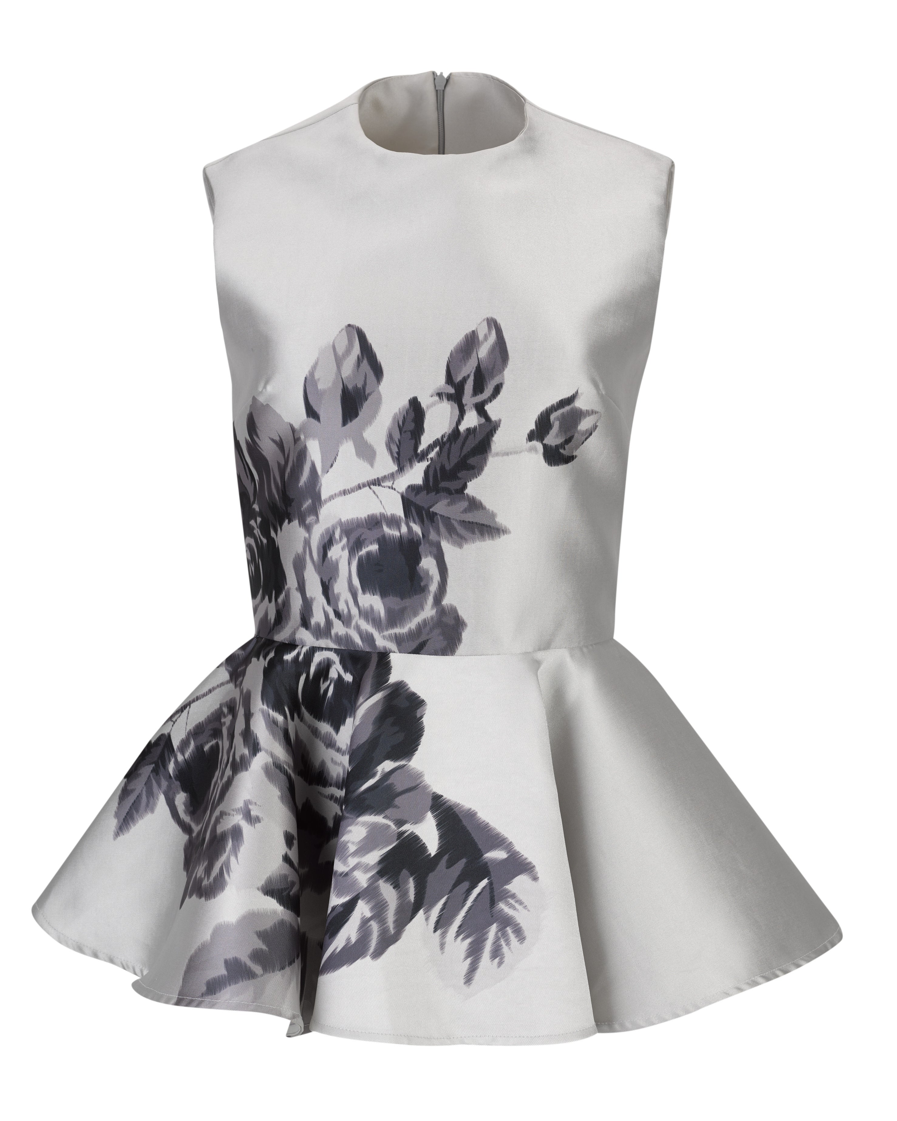 This grey mikado peplum top blends sophisticated structure with casual elegance. Sleeveless and adorned with bold black floral prints, it offers a fresh, modern look perfect for day-to-night wear. The round neckline keeps it classic, while the back zipper ensures a sleek fit. Ideal for those who appreciate a stylish yet effortless vibe.